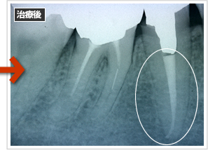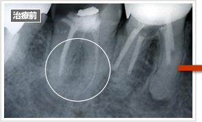 以下の症例でも根の先の溶けた歯が治療後には再生しています。